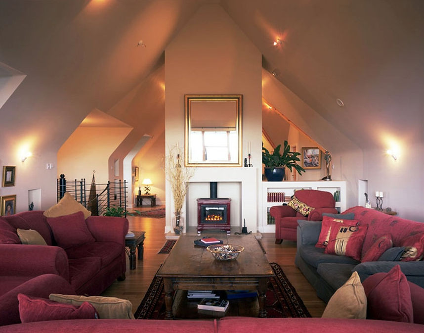 Large detached dwelling (circa 5000sq.ft.) for a private client in the Loch Lomond National Park. The dwelling commands wonderful views towards the loch. Because the views are so wonderful it was decided to locate the main living space on the upper floor. This living room and the dining room below are connected by a secondary spiral stair with the main feature staircase located in the heart of the cruciform plan. Extensive gardens with 2 No. pools provide a setting for this modern dwelling featuring very high levels of insulation, heat recovery etc. The dwelling, whilst modern, uses traditional materials such as slate, stone and traditional white harling.